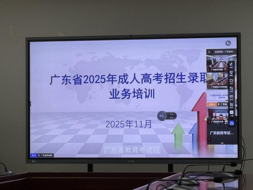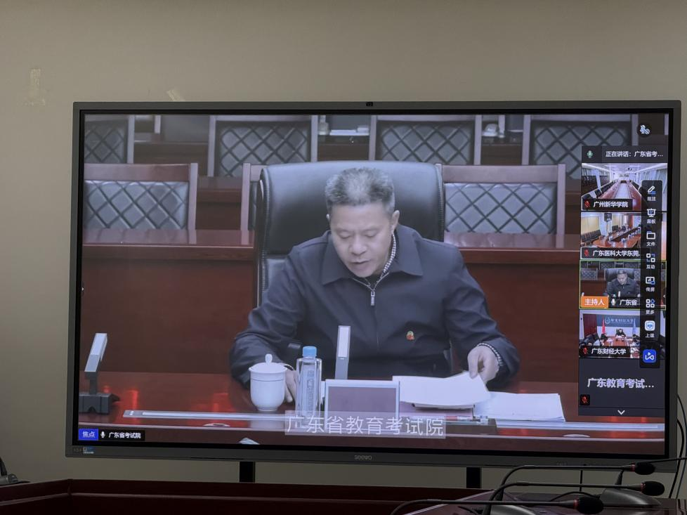2025年11月28日上午,广东省教育考试院召开2025年成人高考录取工作动员培训视频会议。广州新华学院(以下简称“我校”)在东莞校区格物楼②B301会议室设分会场,我校副校长李毅、继续教育学院副院长(主持工作)林圣封、综合办公室主任陈卫聪以及招生部成员出席会议。会议由广东省教育考试院副院长、省招生办副主任周旭主持。