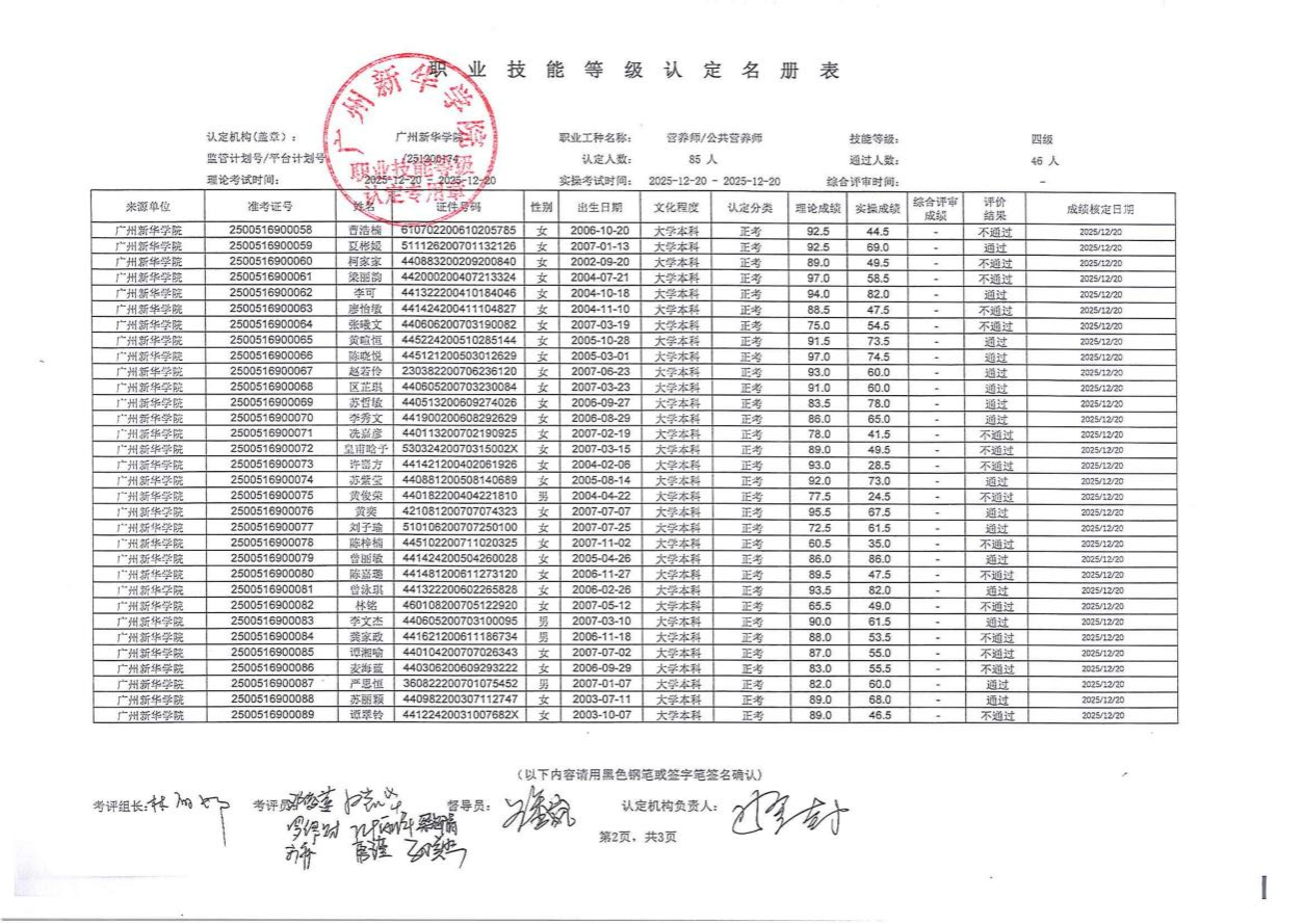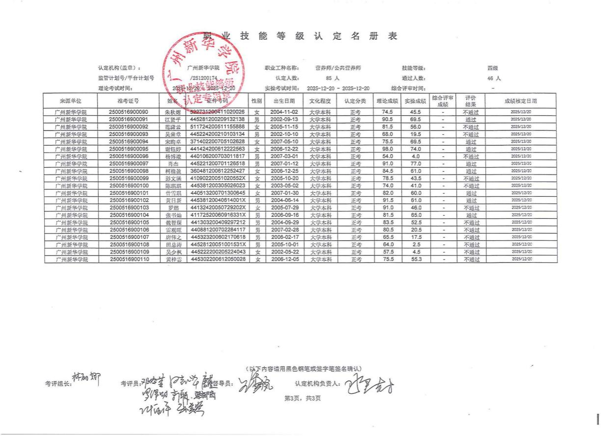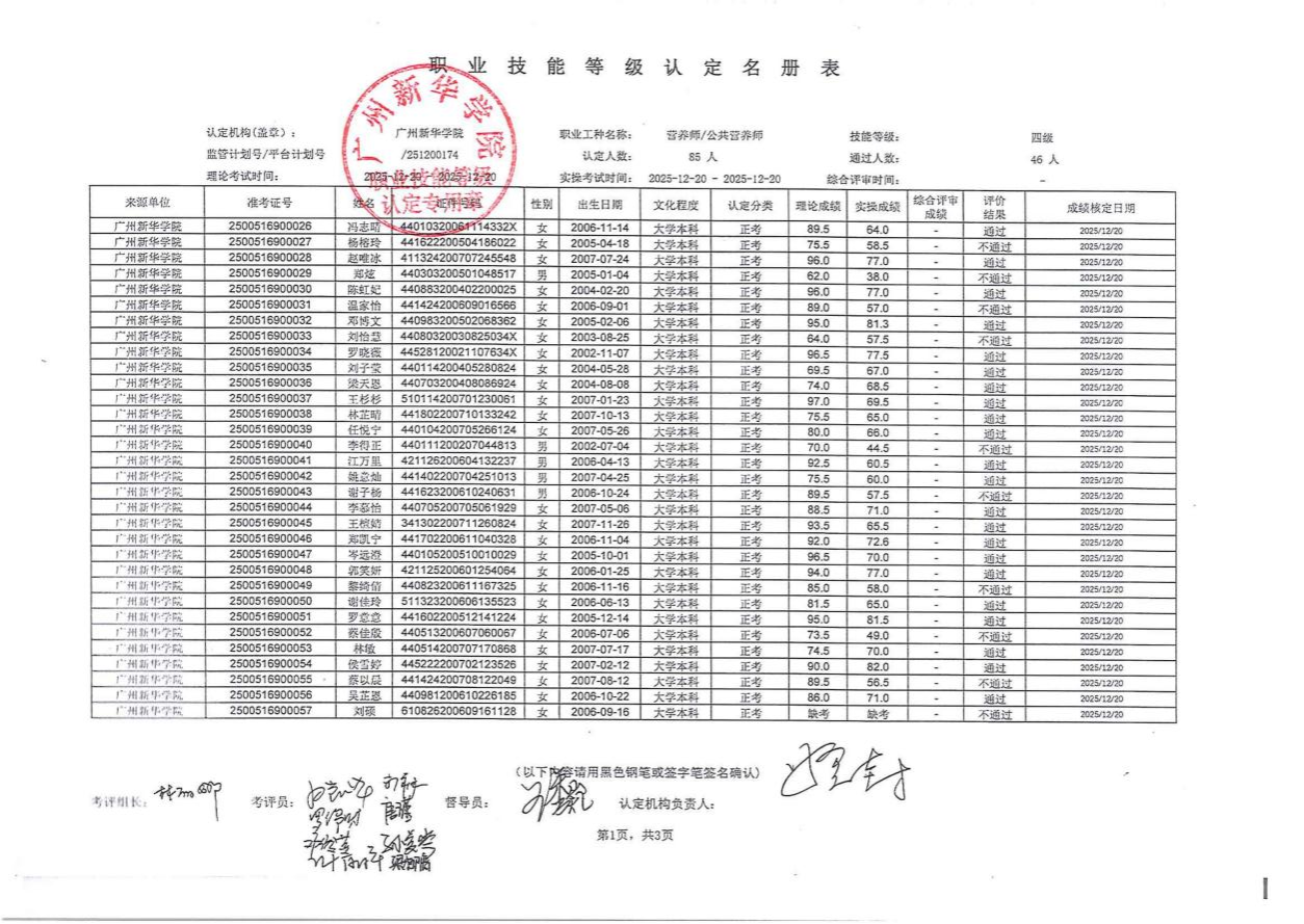 我校于2025年12月20日成功举办了营养师(公共营养师)四级职业技能等级认定考试。此次认定旨在提高我校护理学、药学、健康服务与管理等相关专业学生的职业技能水平,共有85名学生报名参加。整个考试过程组织严密,井然有序。考生在理论考试和实操考核中均表现出良好的规范性和专业性。考评员对考生进行了认真细致的考评,考务和督导员对考试过程进行了严格审核,确保了成绩评定的公正性。现将考试成绩公示如下: