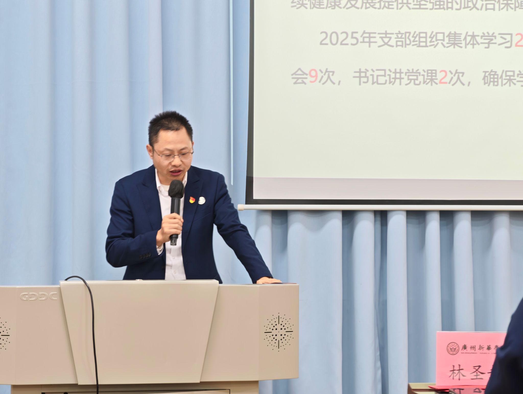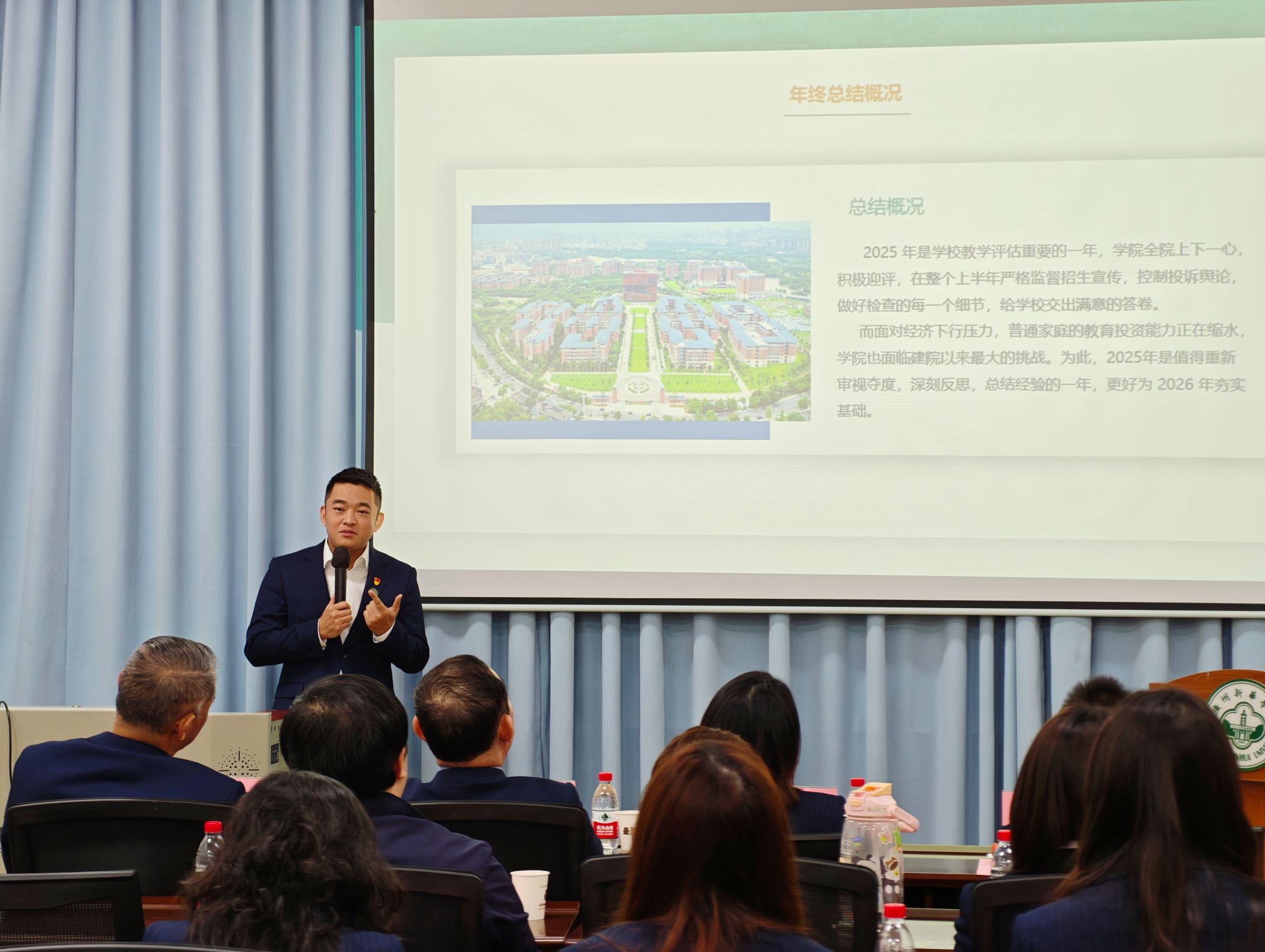 随后,综合办公室主任陈卫聪对2025年学院重点工作做了复盘总结,并以党的百年奋斗历程视频激励大家在新的一年里鼓足干劲,他表示新的一年要在做好东莞校区继续教育业务的同时,加大广州校区继续教育业务的拓展,实现继续教育一校两区的新格局,为学院发展增添新动能。